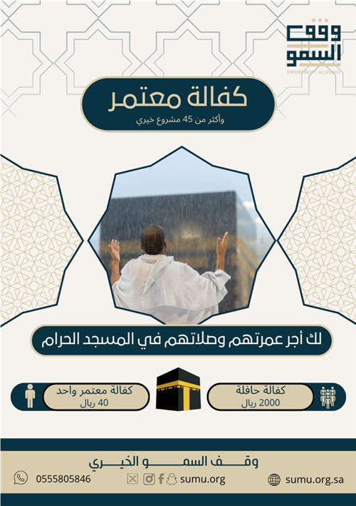 يهدف مشروع كفالة معتمر إلى تمكين الراغبين في أداء شعيرة العمرة من الفئات المستحقة (ذوي الدخل المحدود والمستفيدين من الجمعيات الخيرية)، وذلك عبر تغطية تكاليف النقل والإعاشة والتنظيم بالتعاون مع جهات مختصة في تنظيم رحلات العمرة. يسعى المشروع إلى تحقيق مبدأ التكافل، وربط المجتمع ببيت الله الحرام، وتعزيز روح العطاء من خلال فتح باب المشاركة في كفالة المعتمرين ونيل الأجر العظيم.